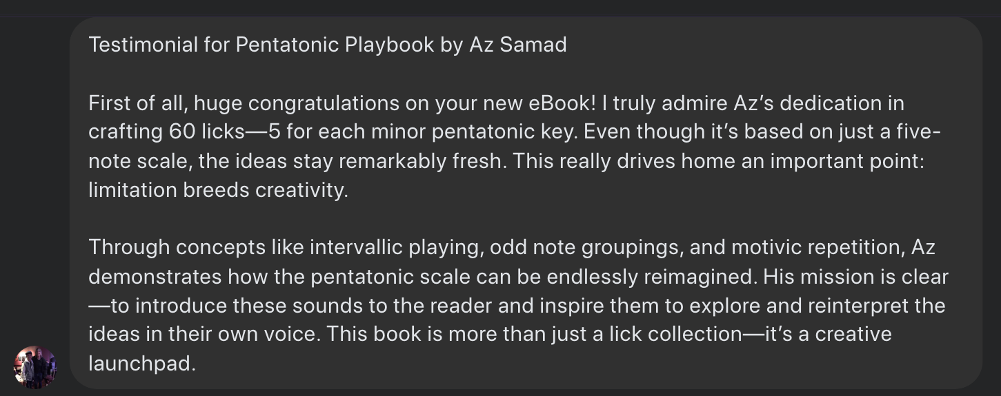 "This is an amazing book. Az Samad always uses a no nonsense approach to teaching and making music. As a classical cellist with a little bit of creativity, I was able to use this Pentatonic Playbook. The lines in this book are beautifully written and rewarding to work on so that one doesn't feel like they practicing but actually working on music."