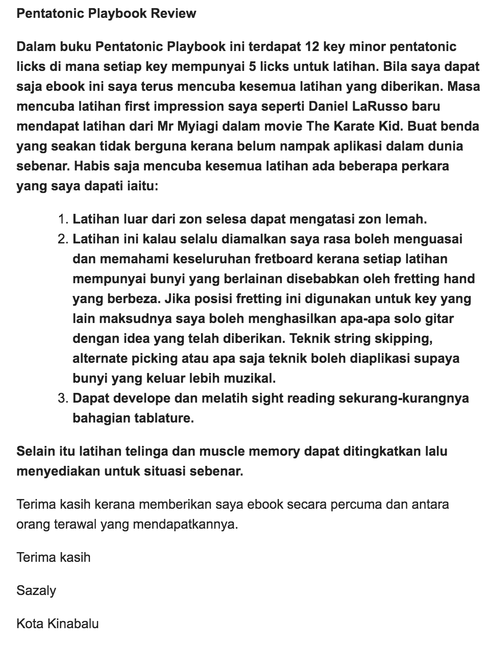 "I already go through this Ebook...and I really like the exercises in it.. practical and easy to understand especially for those who wants to know more about minor pentatonic scales...siap bleh bljar shape dan pattern minor pentatonic untk stiap chord,from E minor smpai Eb minor ..this book is great... thanks a lot for this book..!!.🙏🏼"